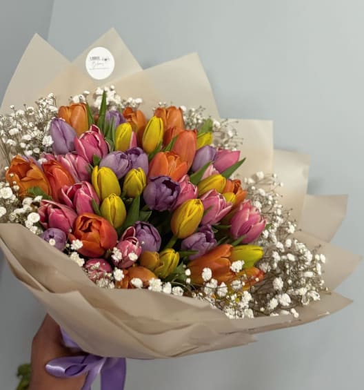 Vibrant tulips in cheerful hues of orange, purple, yellow, and pink, gently accented with soft white baby’s breath. Wrapped in elegance, it’s a perfect springtime gift of warmth and love.